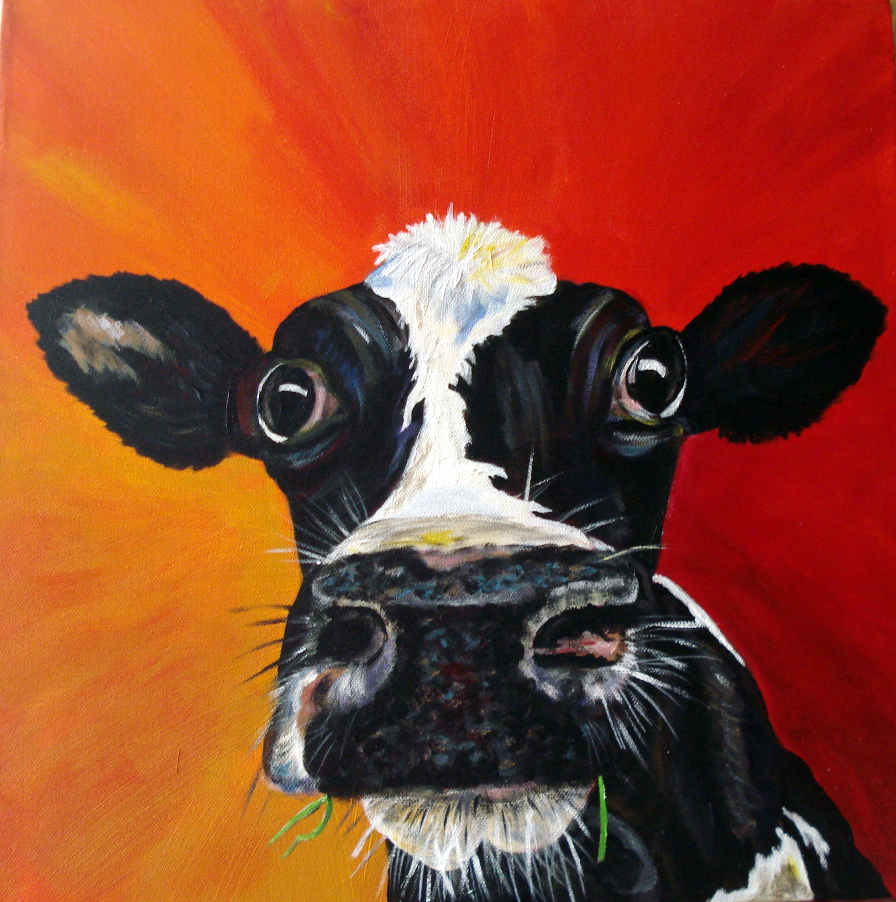 Nieuwsgierig kalfje schilderd op een rode abstracte achtergrond