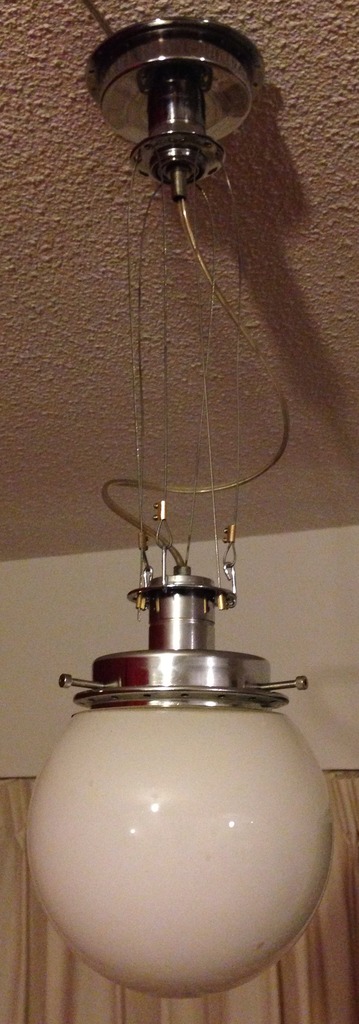 Hangende lamp, eenvoudig verstelbaar in hoogte. De lamp bestaat uit twee trommelremnaven met een melkglazen bol, verbonden door remkabels.