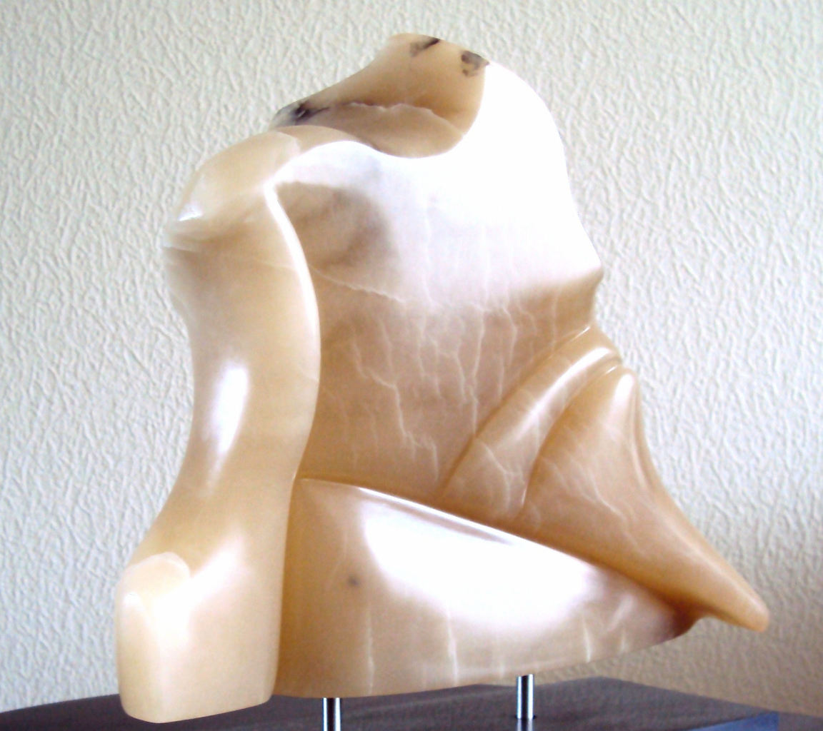 THEA SABELIS (1945)geboren te'sGravenhage .Mijn beelden zijn abstract ,de harde steen die ik bewerk tot een aaibaar lap stof.