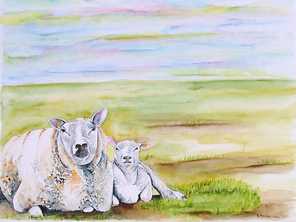Het lieflijke landleven in alle rust liggen de ooi en het lam in de wei
