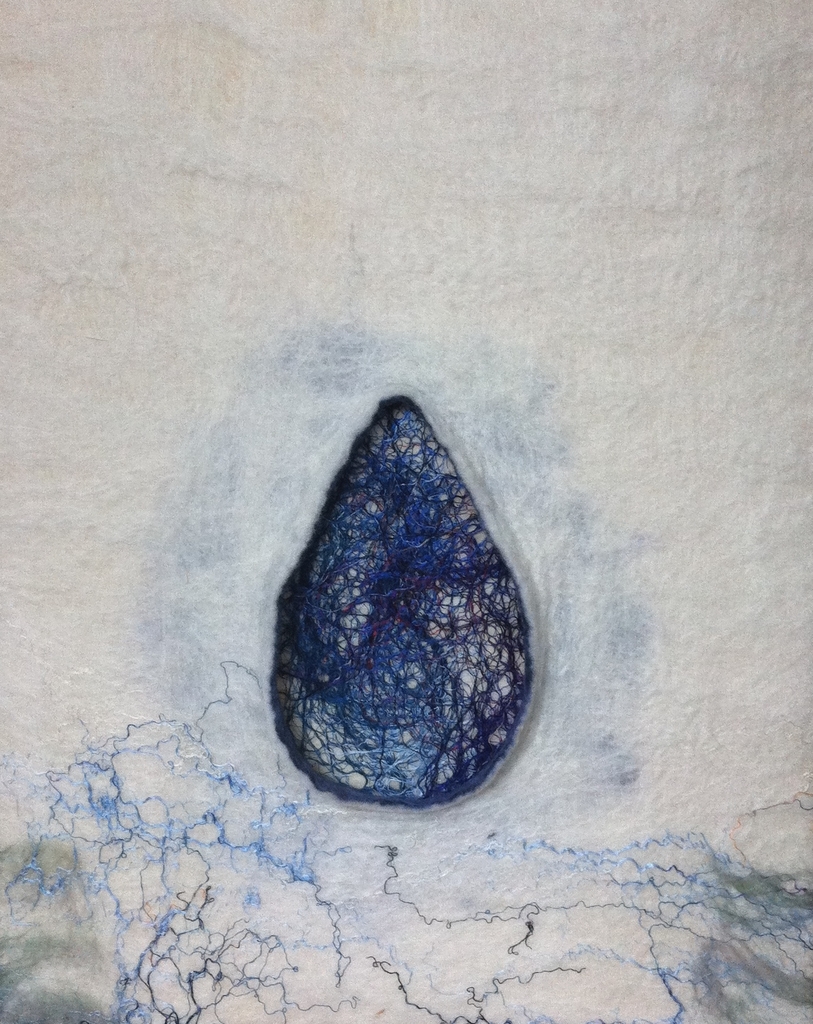 viltpaneel in blauw en wit, met zijdedraad. In opdracht gemaakt voor een bedrijf dat met waterinstallaties werkt.