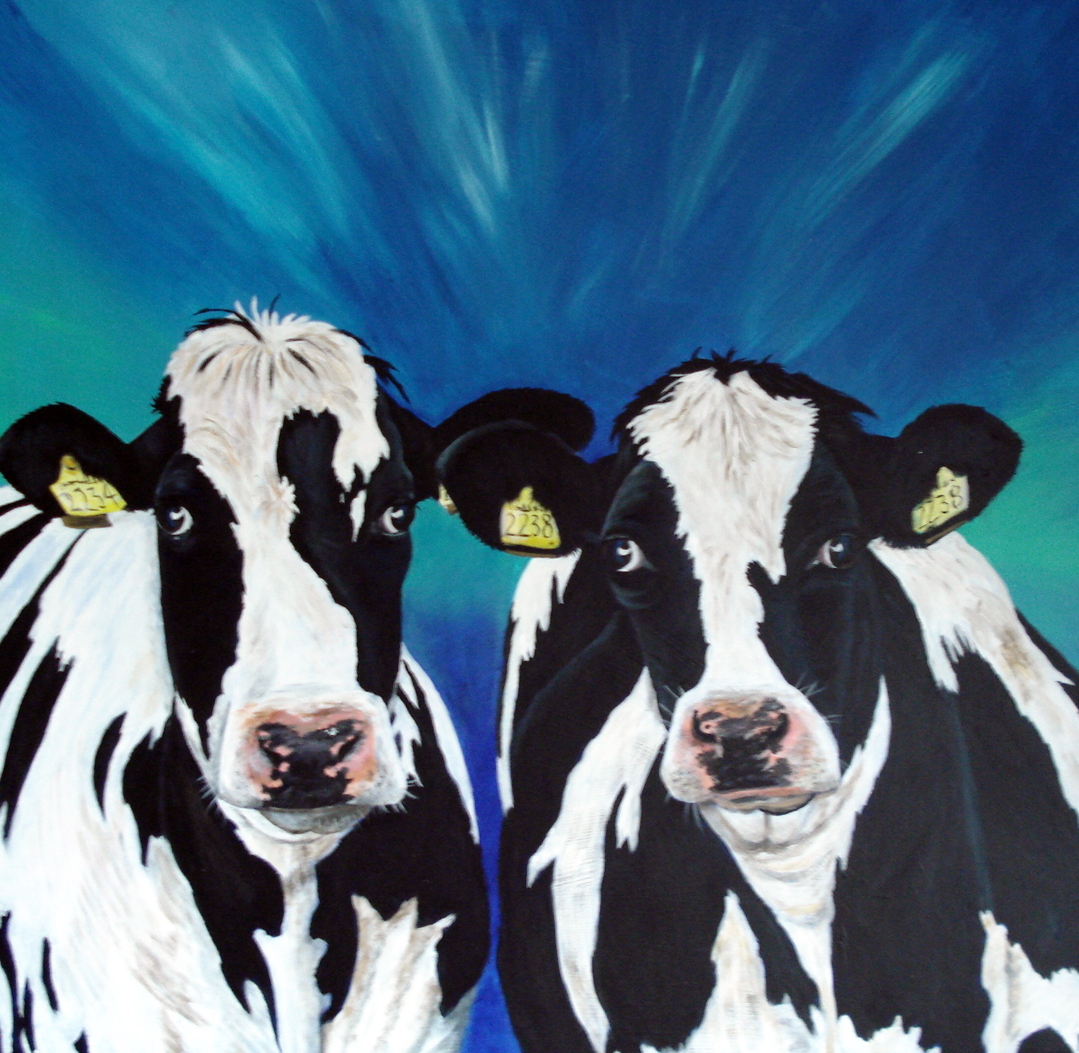 Twee zwartbonte koeien die nieuwsgierig in een blauwe wereld kijken