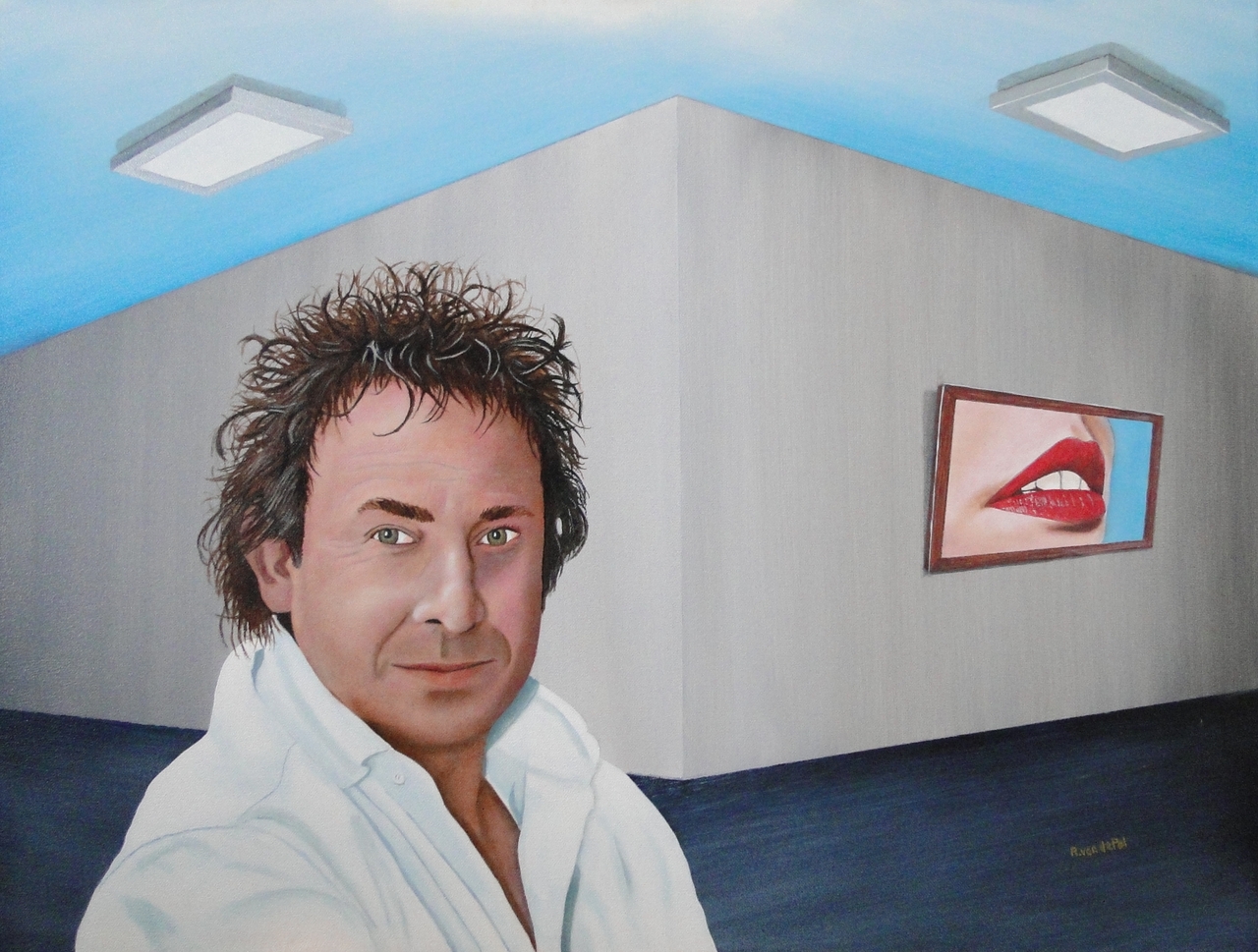 Hier zie je een doek van 60x80 cm van marco Borsato in de hal met een klein doek waarop je het thema: vandaag is rood de kleur van je lippen staat