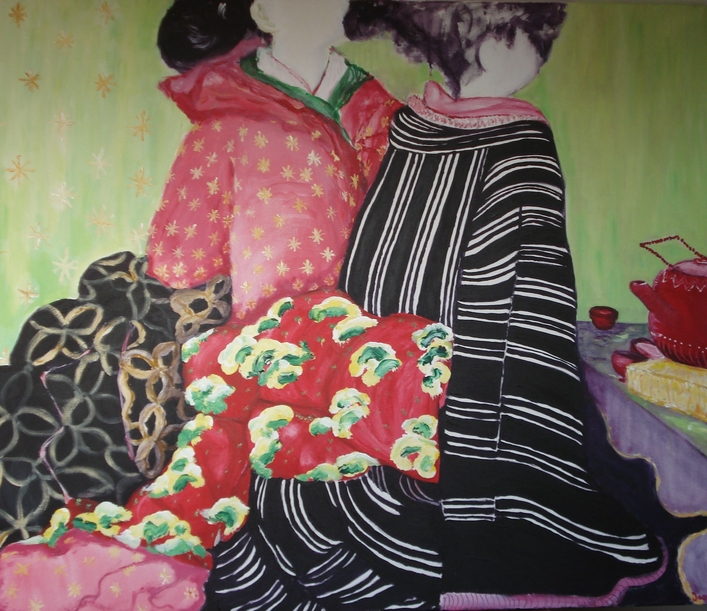 De geisha wordt vaak voor de theeceremonie gevraagd door rijke Japanse zakenlieden. Zij moet dit volgens de traditionele wijze uitvoeren. Zij moeten een perfecte en rechte houding hebben om met sierlijke bewegingen de handelingen te kunnen verrichten. Hiervoor moet je een goed evenwichtsgevoel hebben. De obi zit namelijk heel strak en zwaar om de kimono gewikkeld en geknoopt en belemmert vaak in de beweging. In dit schildersstuk heb ik de geisha’s in een eenvoudige dracht weergegeven. De strepen in de zwarte kimono heb ik gewoon opengelaten, zodat het doek zichtbaar is. De aandacht is gericht op de obi’s. De eerste obi is landschappelijk en die ernaast donker met kruisvormige bloembladen. Voor sommige vrouwen is het een kruis om zo’n kostuum te dragen. Zij doen het toch, vanwege een zeker aanzien. In het Japan van nu is het ondanks dat er een vrouwelijk astronaut is en een meisje dat professioneel honkbal speelt, toch moeilijk om van de traditionele vrouwenrol los te komen. Opoffering en dienstbaarheid gelden nog steeds als hoogste doel voor vrouwen.