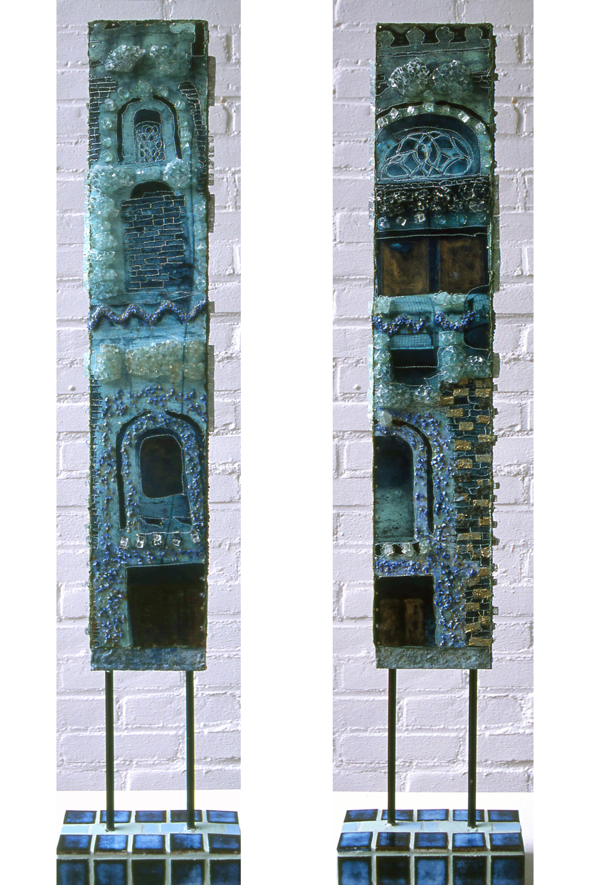 Combinatie van fotografie, stof, glas, verf en keramiek