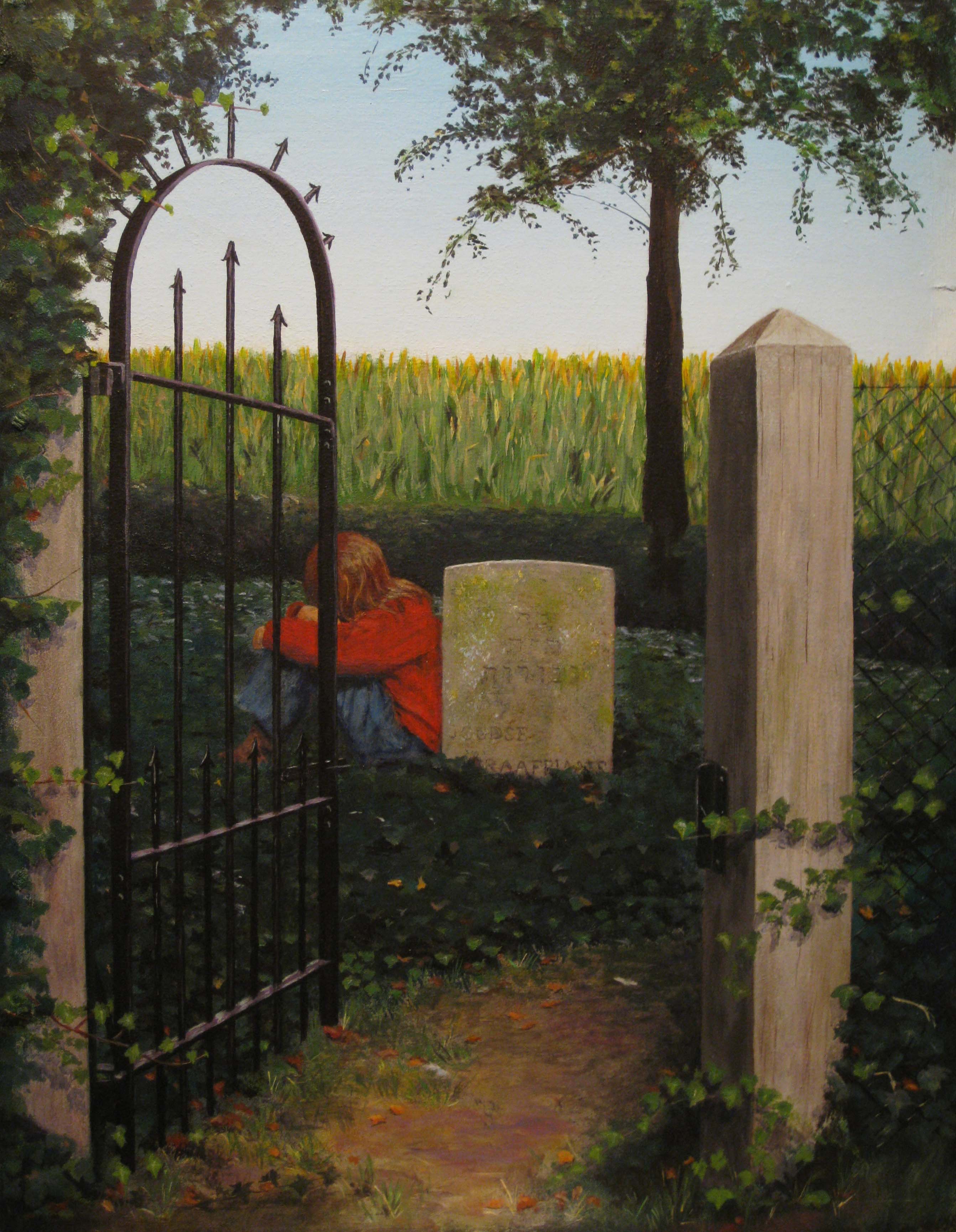 Meisje Landschap Acryl Rode De Verdriet Hek Spijkerbroek Poort Begraafplaats Stil Joodse Den Es Trui Roodharig Klimop Lindeboom Ham Maisveld Openstaande