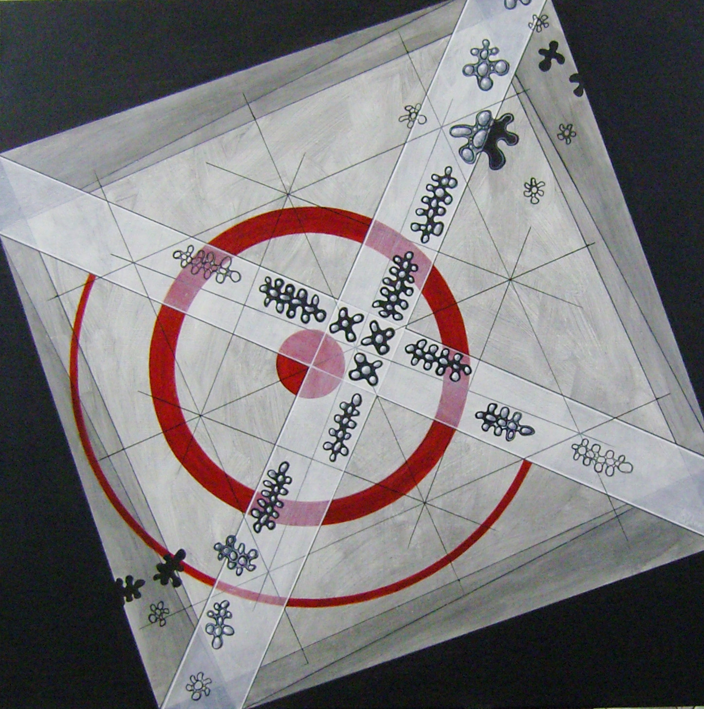 Thema: Chaos (Geometrische Chaos) Mijn kunst is beïnvloedt door de moderne wiskundige en wetenschappelijke benadering van het begrip complexe orde van de natuur. Met name heb ik me verdiept in de Chaos theorie en de fractal geometrie. Ik ben geen wiskundige, en ik gebruik geen wiskundige formules. De ideeën van de Chaos theorie en fractal geometrie leiden tot de ontwikkeling van de composities in mijn werk. Ik gebruik driehoeken,vierkanten en cirkels in mijn schilderijen, maar in mijn huidige serie, geoChao richt ik me alleen op de vierkanten en de verhoudingen tussen de vierkanten. Ik ontwikkel mijn composities door kleine vierkantjes op grote te zetten of grote op kleine te zetten. Het gaat om de onderlinge verhoudingen tussen de vierkanten. Ik laat de methode die ik kies de compositi