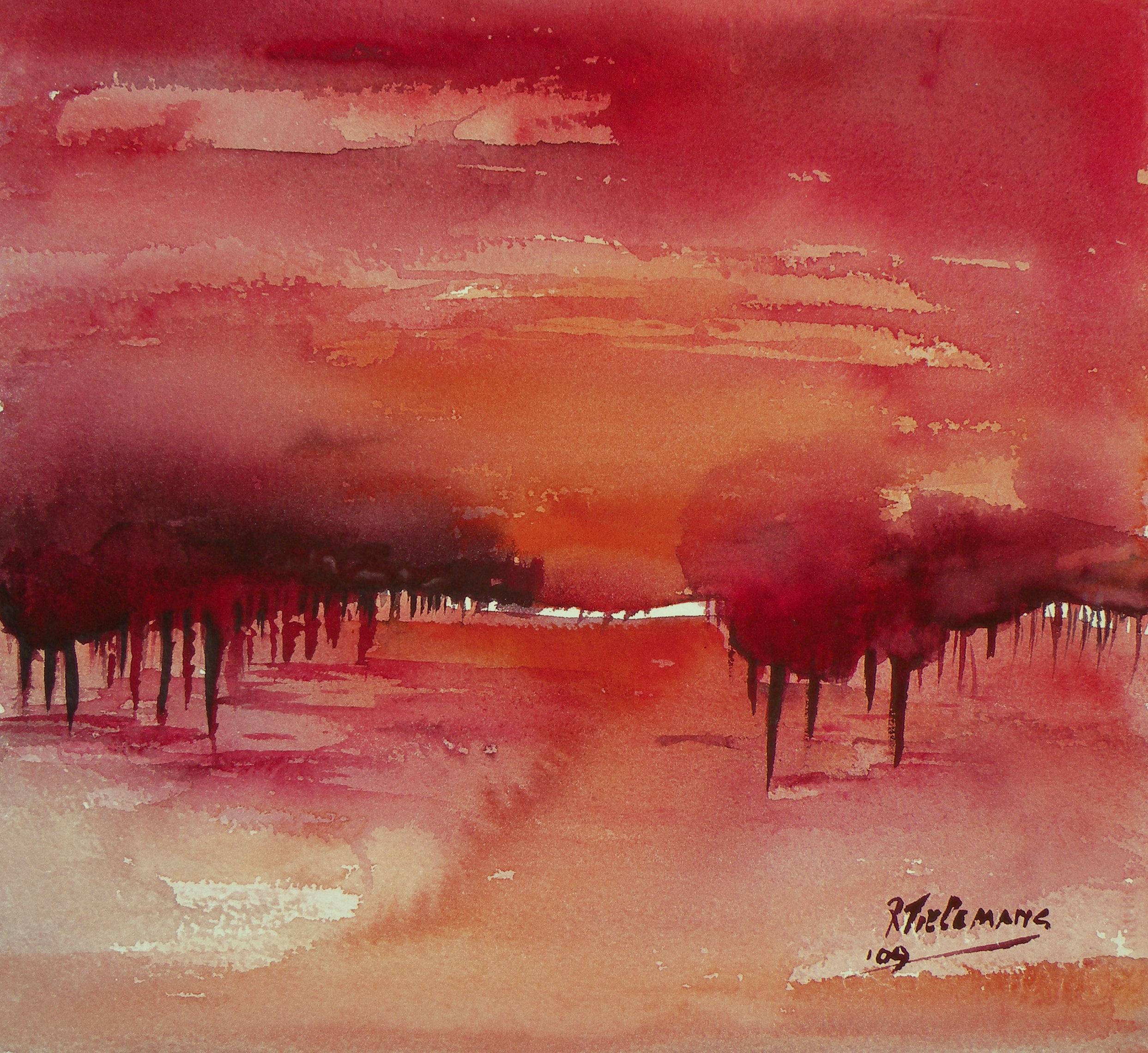 Wit Rood Zwart Landschap Bruin Aquarel Natuur Bomen Abstraherend Red Black White Brown Landscape Avond Nature Trees Watercolour Evening Abstracting