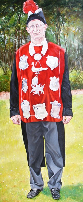 Op dit schilderij ziet u de gildekoning van het gilde uit Heeswijk-Dinther. Op zijn mooie rode vest ziet u vele zilveren schilden die door de tijd heen zijn verkregen.