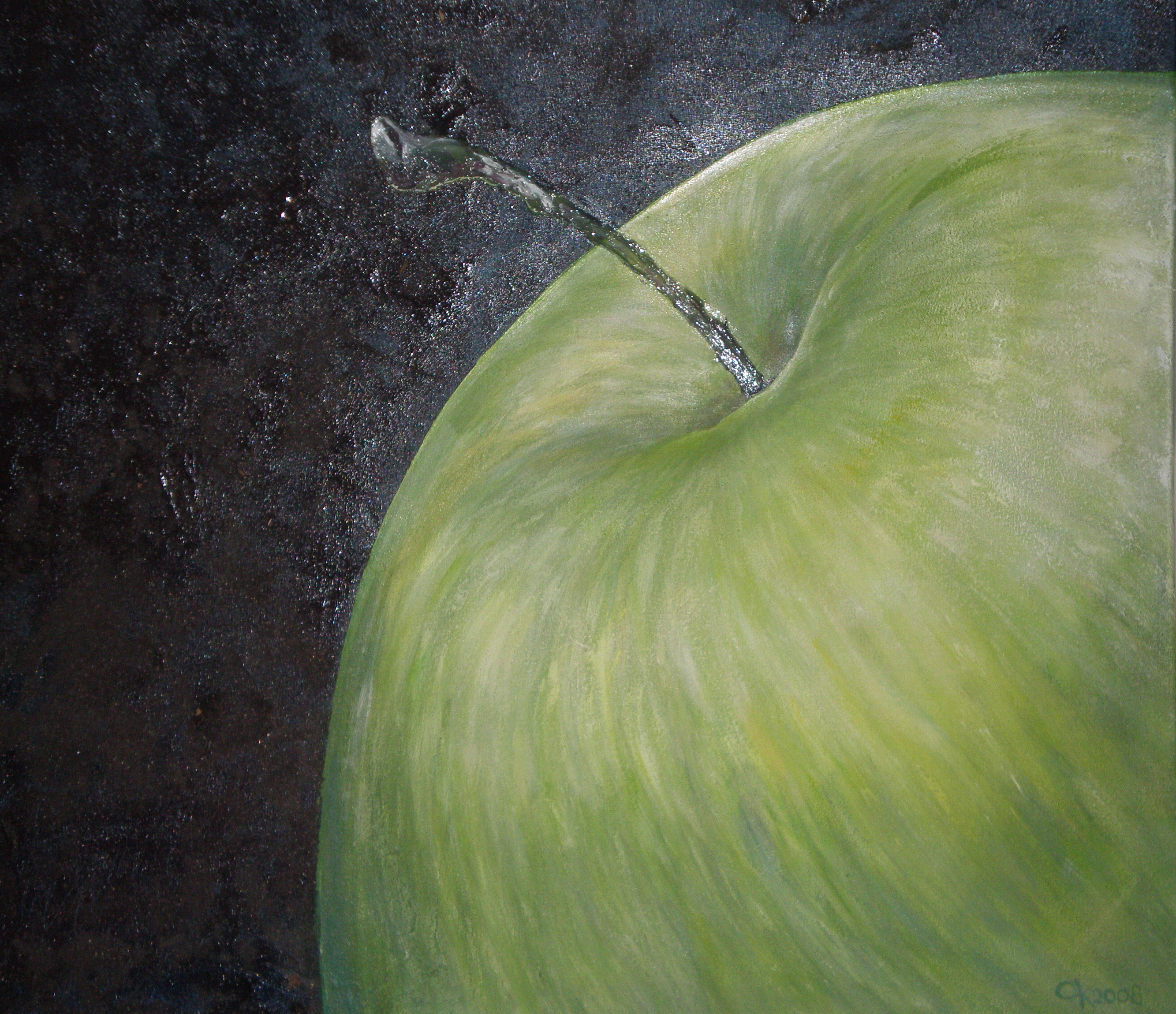 Groen appel op doek. Het steeltje van de appel is verdikt met waardoor er een 3 dimensioneel beeld ontstaat. De achtergrond is donkerblauw/zwart. Rondom de appel is zand verwerkt wat een apart effect en relief geeft. 60 x 60 x 3 cm