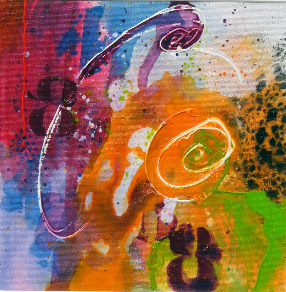 kleurrijke expressie op doek in passe partout van 50 x 50 met zilverkleurige omlijsting