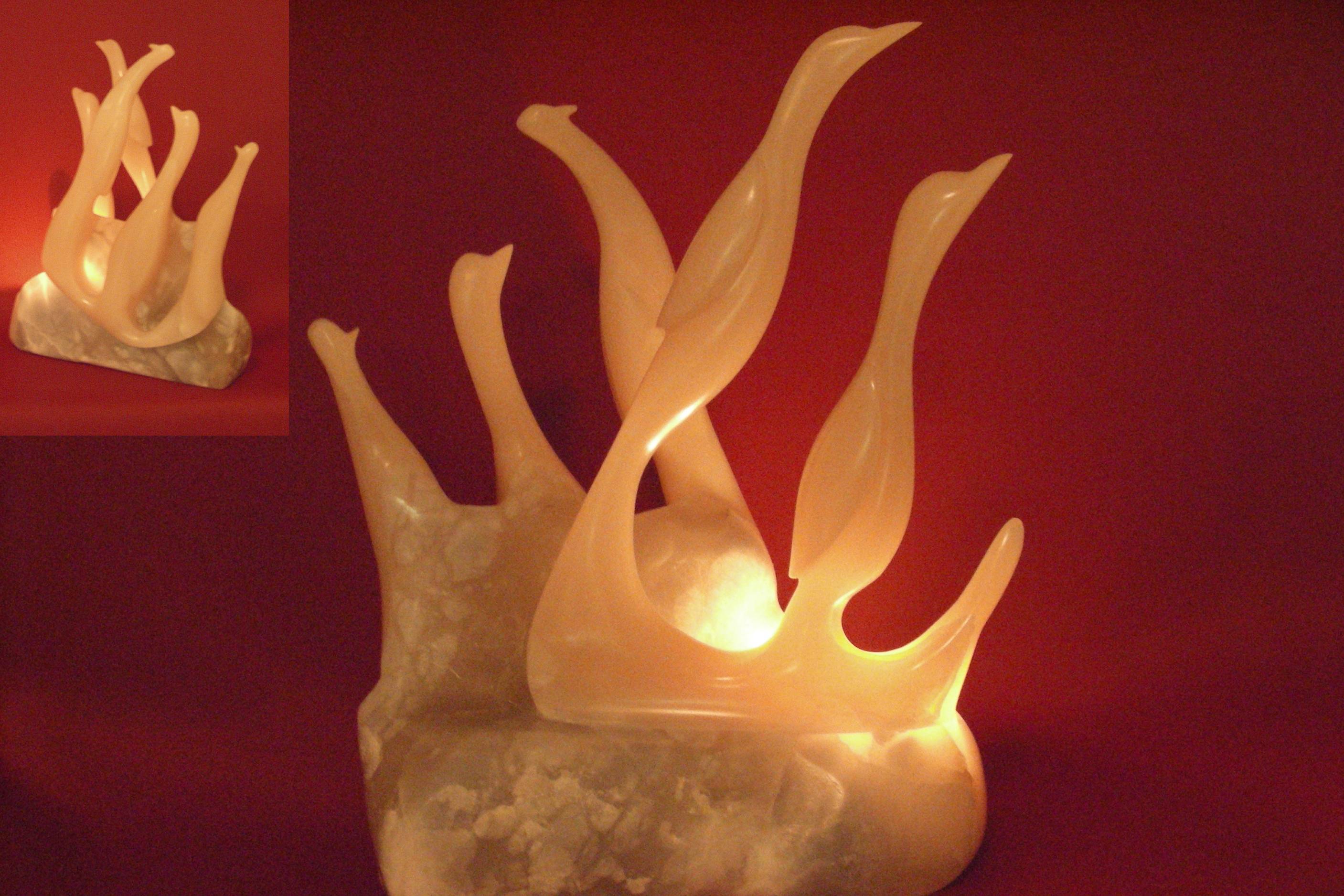 'Flying out' In opdracht gemaakt. Het is gemaakt van Steatiet en gemonteerd op blauw witte Albast