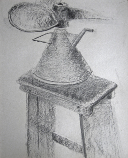 ACADEMISCHE SCHETS - Oliekan, propeller en kruk. Houtskool. Afmetingen 50 x 65 cm.