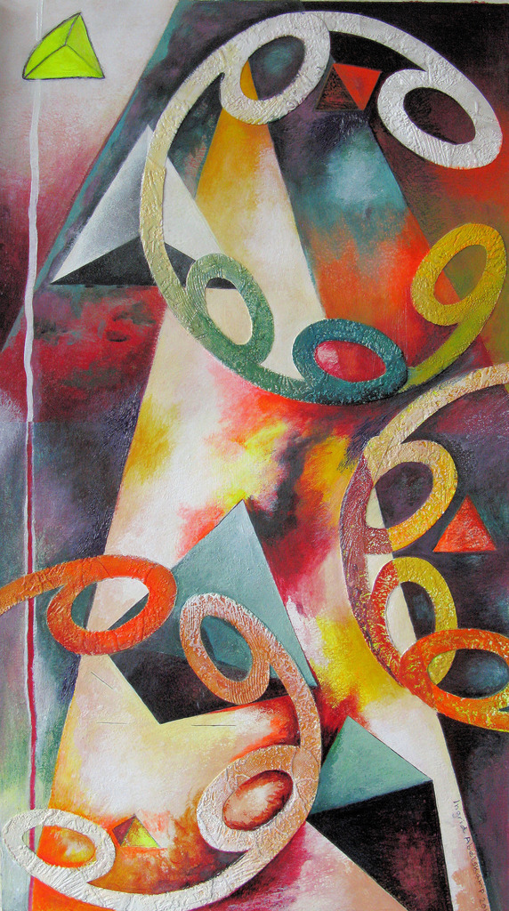 Statisch en beetje speels, scherp (driehoeken) in combi met zacht (gebogen vormen), vlak, plat, diep,harmonieus in vorm en kleurgebruik, vrij in gebondenheid, de vrijheid in invulling, de gebondenheid in vorm.De gebogen vorm maakt het zacht.De driehoeken voelde hard.Zoektocht naar zachtheid en milder.