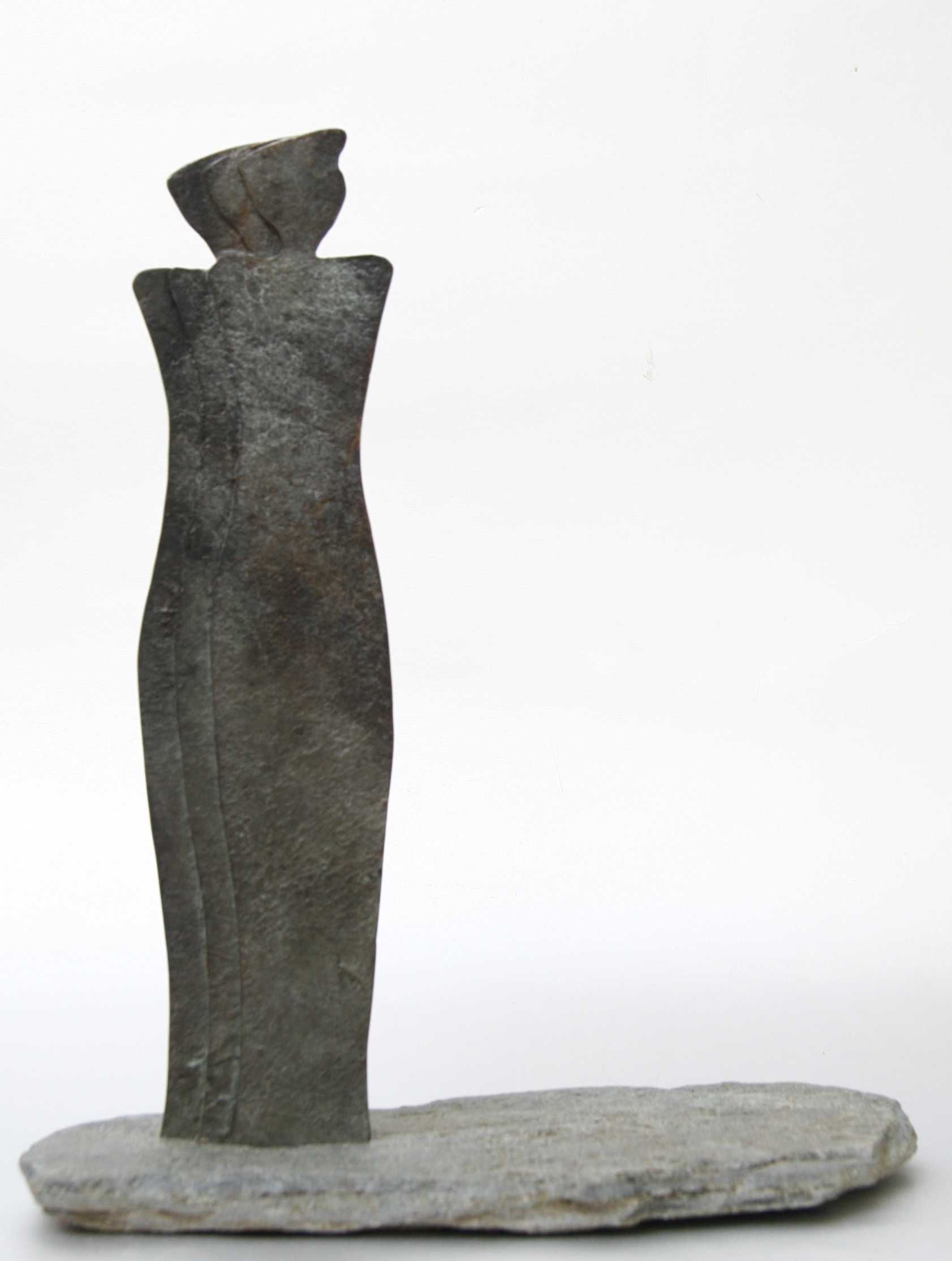 Drie bronzen vrouwenfiguren achter elkaar gesitueerd op een platte leisteen. De afmetingen zijn inclusief de steen. Unicum.