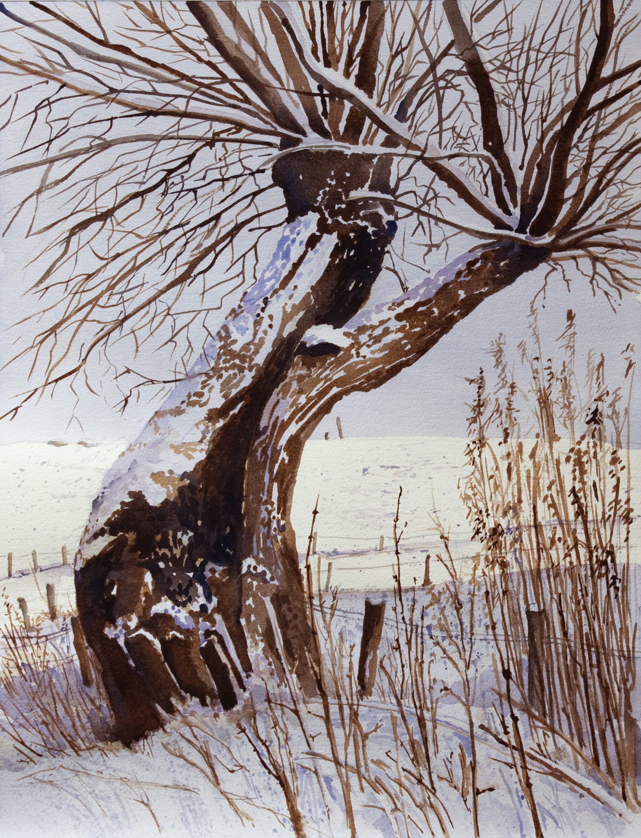 Kerst Landschap Aquarel Realistisch Sneeuw Boom Landscape Tree Riet Prikkeldraad Schaduw Realistic Watercolour Paaltjes Snow Knotwilg Weggetje Path Dike Poles Willow Shade Dijkje Reeds Barbwire