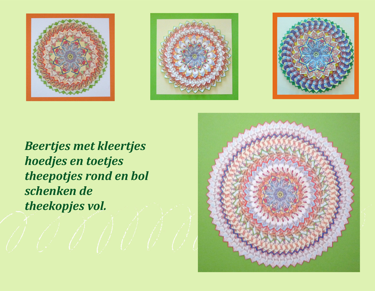 Ik ben geboren in 1945 en ben met het maken van mandala's begonnen toen ik ophield met werken. Ik heb 2 dochters en 5 kleindochters. Sinds ik in april 2008 (samen met mijn dochter en een vriendin)een workshop mandala's van theezakjes heb gevolgd, ben ik er dagelijks mee bezig (als het effe kan). Het is erg rustgevend. Van mijn mandala's maak ik wenskaarten met mandala's en een spreuk of gedachte en die heb ik laten drukken.