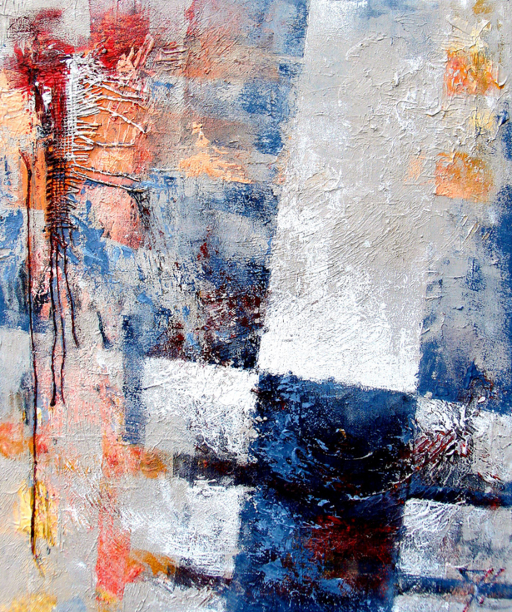 Geometrisch abstract mixed media schilderij in zowel energieke kleuren als rustige tinten. De opbouw in vlakken en lijnen creëert een krachtig evenwicht, terwijl het dikke doek en een krachtige textuur zorgen voor extra diepte en impact. Dit werk straalt rust én vitaliteit uit, en is ook zeer geschikt voor een eigentijdse kantooromgeving. Over het werk: gesigneerd · mixed media op linnen · opgespannen op stevig frame · meegeschilderde zijkanten · 4 cm dik doek · klaar om op te hangen