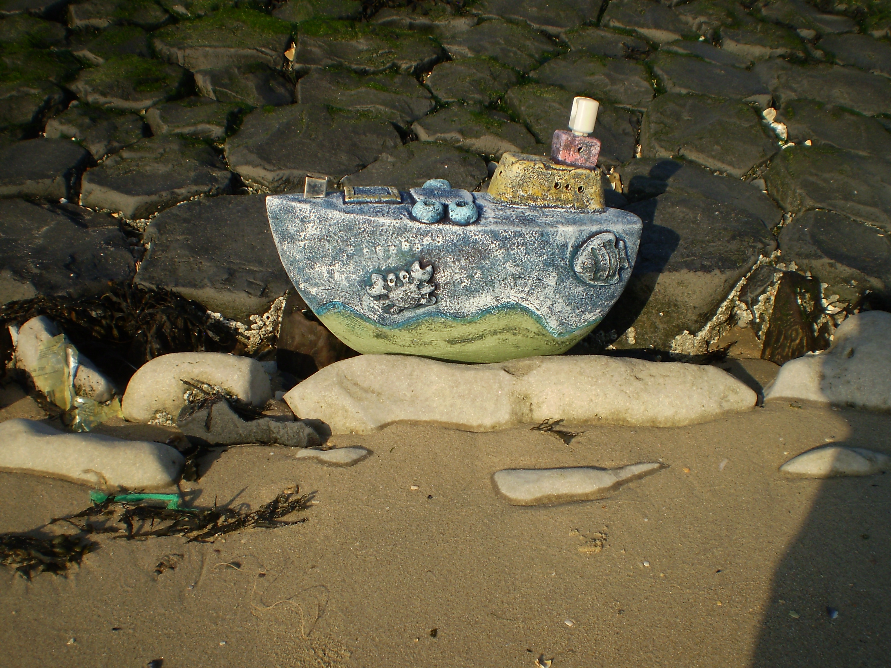 Boot, handgevormde keramiek. bewerkt met engobes en oxyden.