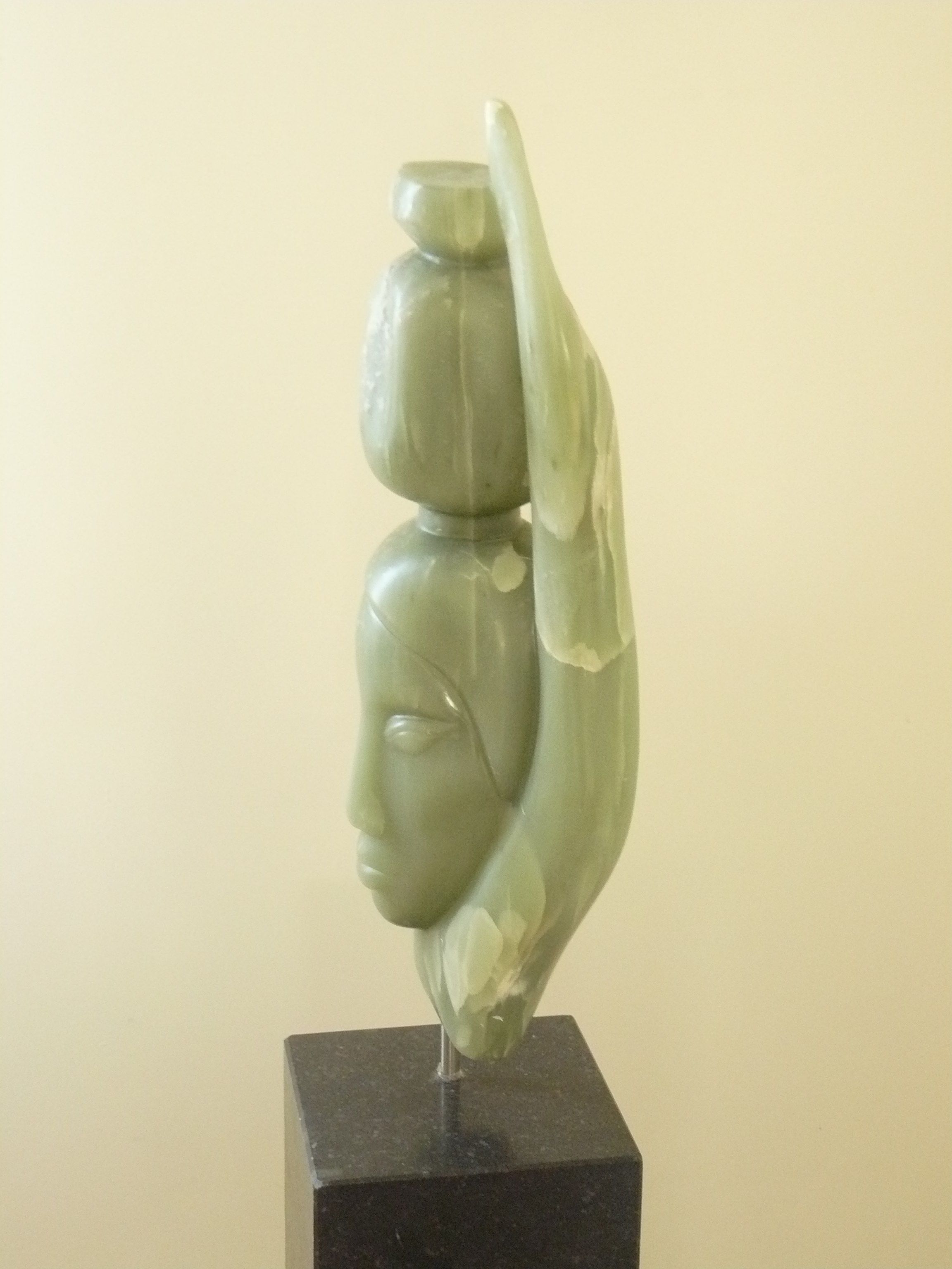 Sierlijke Aziatische vrouw draagt kruik op haar hoofd. Chinees speksteen, kleur groen. Sokkel van Belgisch hardsteen.