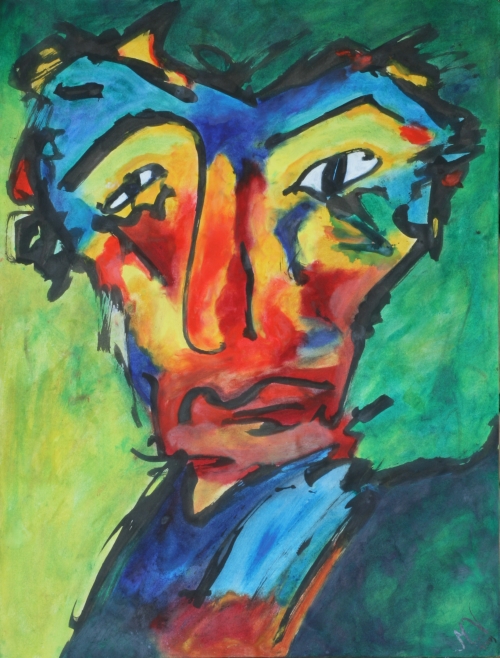Een diepe denker, filosoof, in felle expressionistische kleuren. Wat gaat er toch in dat hoofd om?