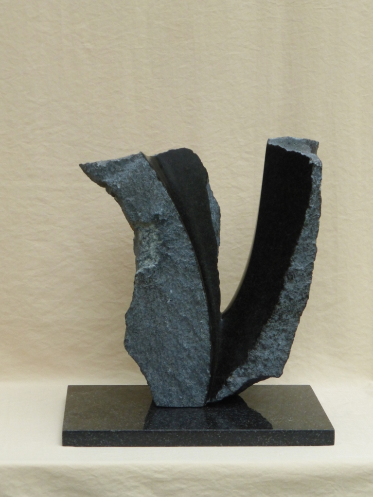 de V is gemaakt van zwarte serpentijn. door in het midden steen weg te halen is er een V ontstaan. Het contrast tussen de gepolijst en de ruwe steen versterkt de vorm. V is geplaatst op een granieten sokkel.