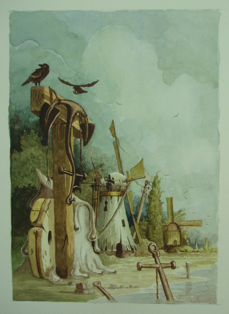 Anker Windmolen Kaars Vogels Landschap Aquarel Papier Realisme Fantasie Romantiek