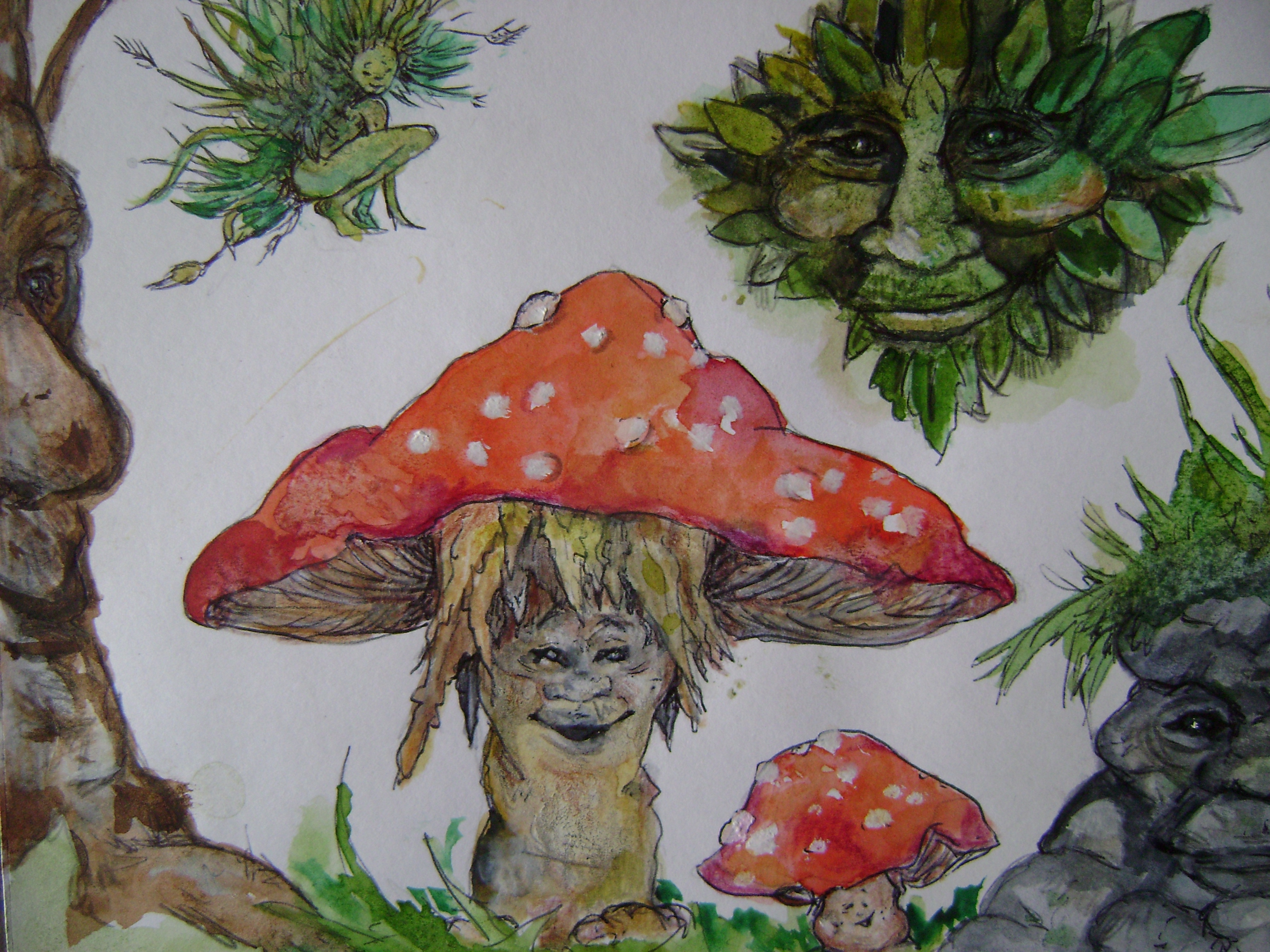 Illustratie van verschillende nauurwezens; zoals de groene man, steenwezen,boomwezen en de paddestoelwezens