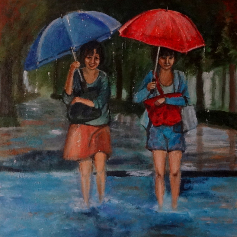 Aziatische meisjes op een regenachtige dag. Afmetingen inclusief lijst 91 x 91 cm; exclusief lijst 75 x 75 januari 2014