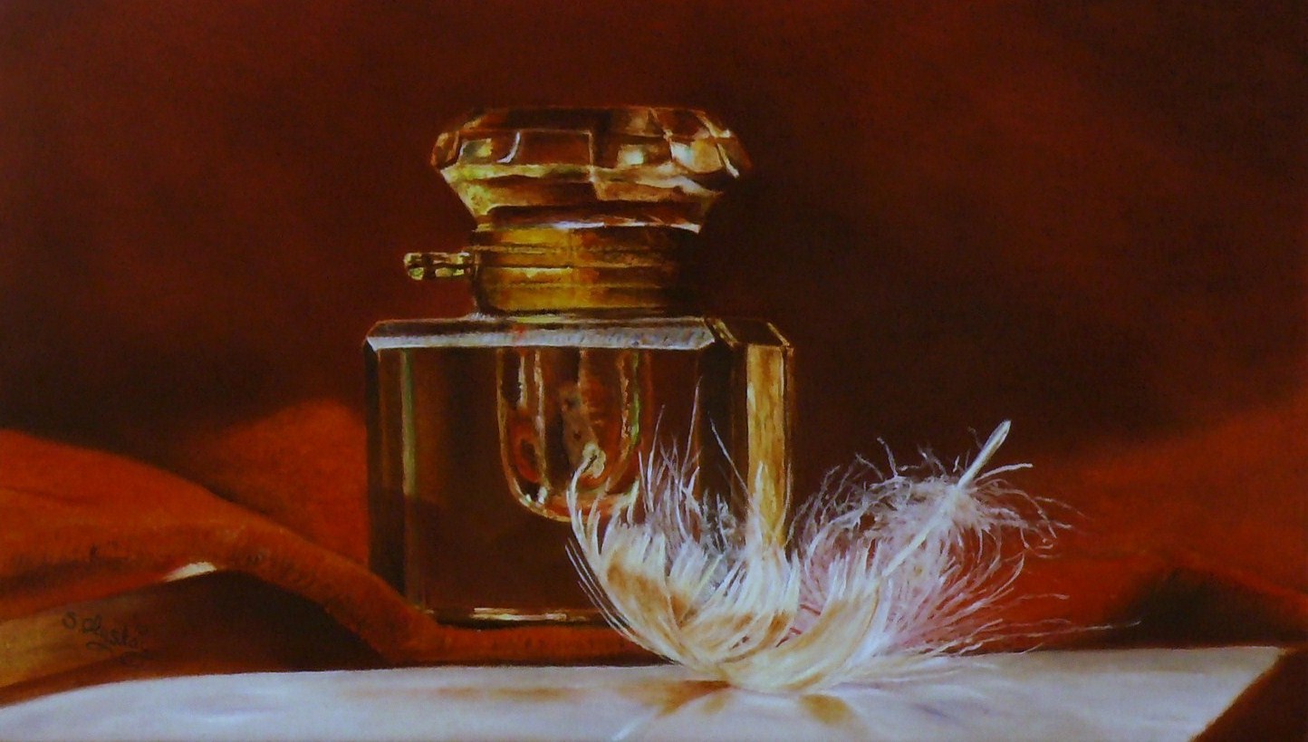 Figuratief Oranje Pot Glas Realistisch Veren Veer Draperie Inktpot