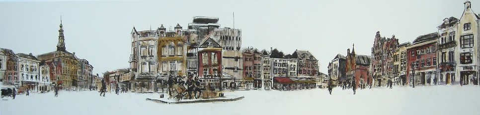 Skyline markt van 's-Hertogenbosch. Getekend en geschilderd met rietpen en penseel in drie kleuren inkt (o.a. Oost-Indische inkt) op doek 25x100 cm.