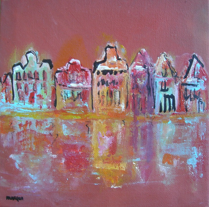 Kleurrijke huizen aan het water op rode achtergrond. Getekend en geschilderd met rietpen en penseel in Oost-Indische inkt en acrylverf op doek 20x20x4 cm.