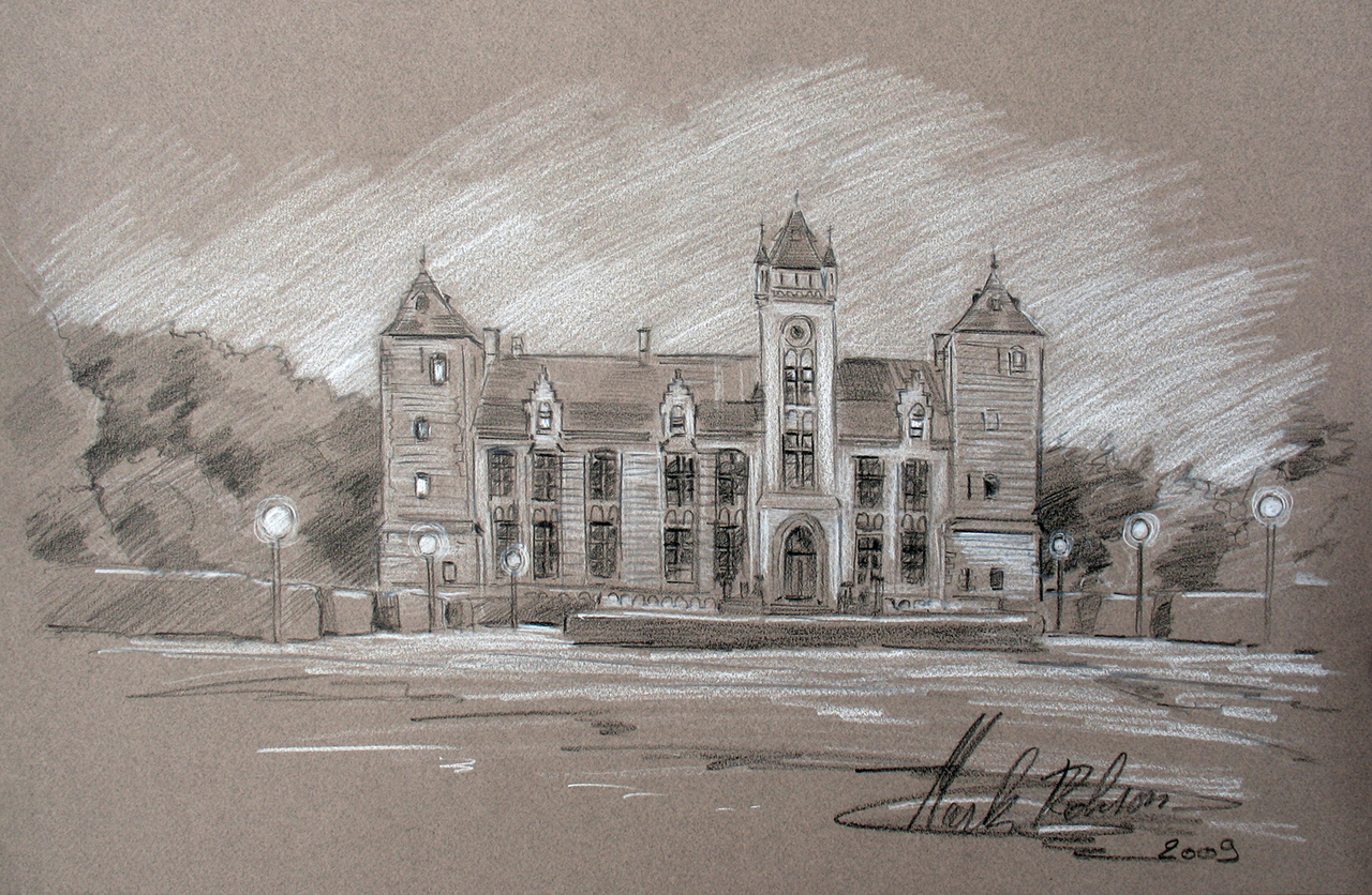 Tillegem kasteel, in het Tillegembos, bij Brugge. Pastelpotlood.