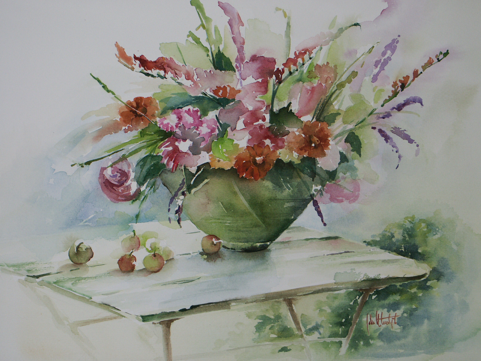 Tuintafel met bloemen in aquarel