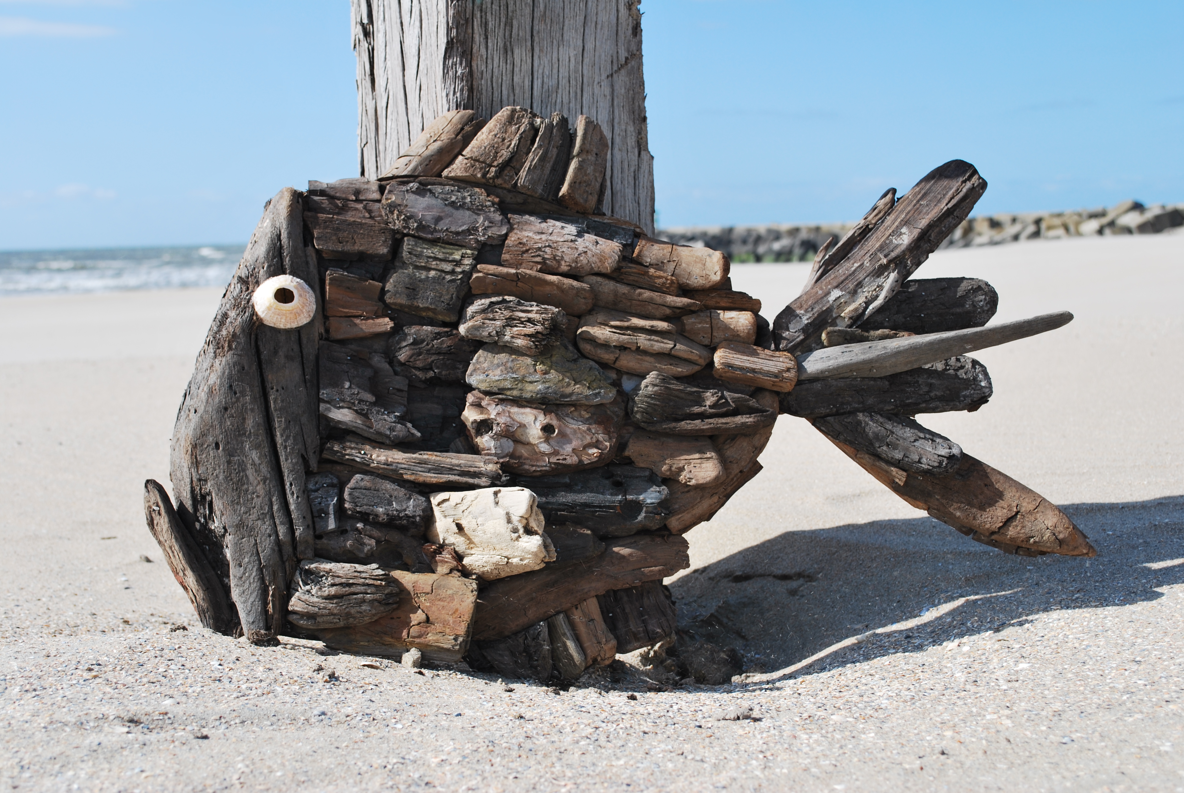 maakt al jaren houten beelden door natuurlijke objecten uit zee te koppelen. De beelden zijn ruw en puur.