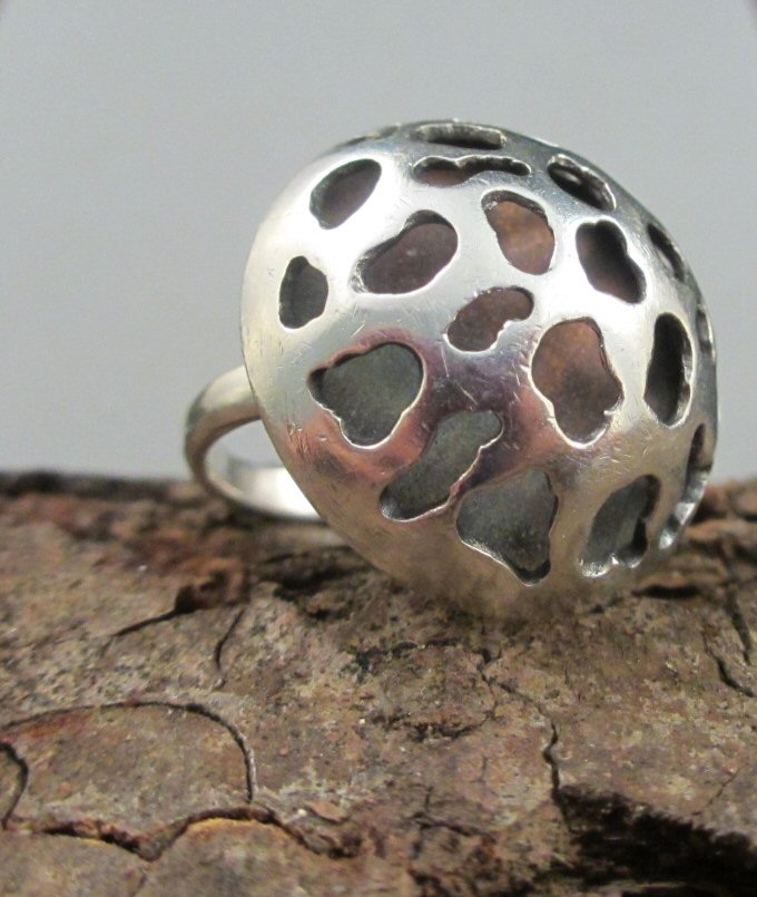 zilveren ring met opengewerkte halve bol. ook verkrijgbaar als hanger en oorbellen