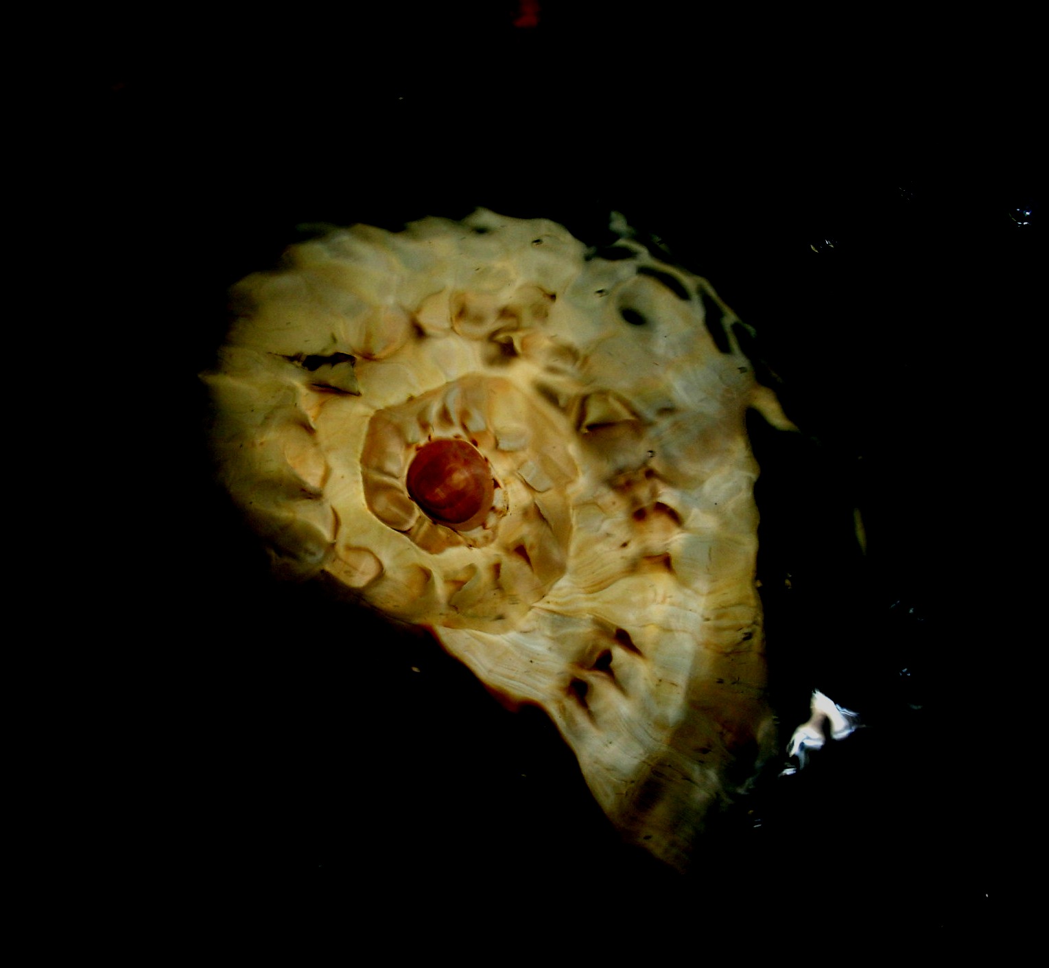 Spiraal in donker water, deze spiraal is aan het verkleuren en neemt steeds meer de huid aan van de natuur in de vijver.