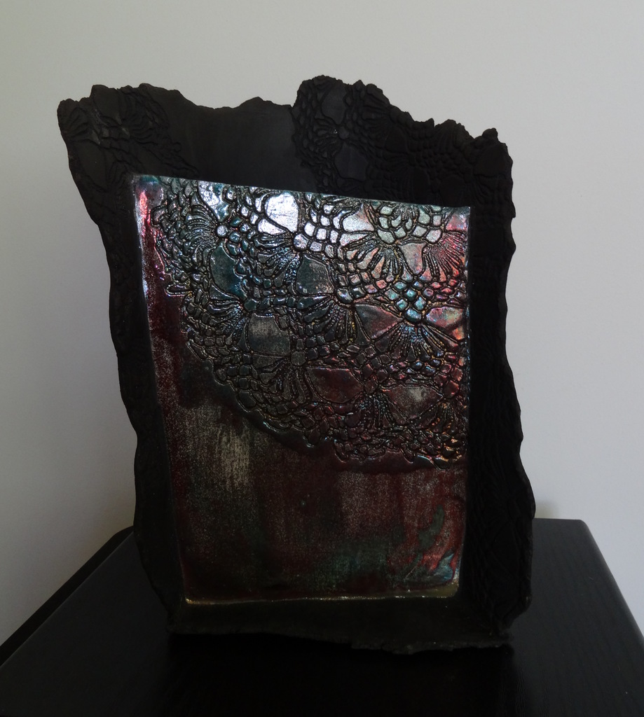 Half ronde 'vaas', raku gestookt. De platte voorkant is met kant en glazuur bewerkt. De Zwart, half ronde achterkant is met dezelfde kant bewerkt.