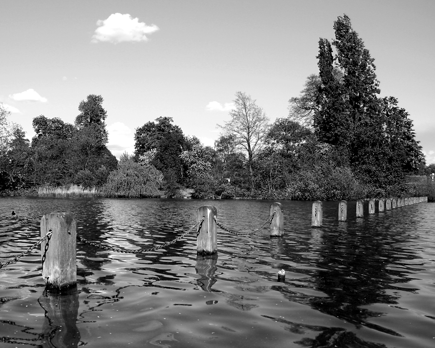 Houten paaltjes in The Serpentine in Kensington Gardens, Londen Oplage: 10 stuks Afdruk op dibond achter acryl glas - z/w foto in een zwart kader (zwarte kader is 4cm aan boven- en onderkant, 5cm links en rechts). De genoemde afmeting (40x50cm) is inclusief het zwarte kader. Achter de foto zit een aluminium u-profiel om het werk op te hangen.