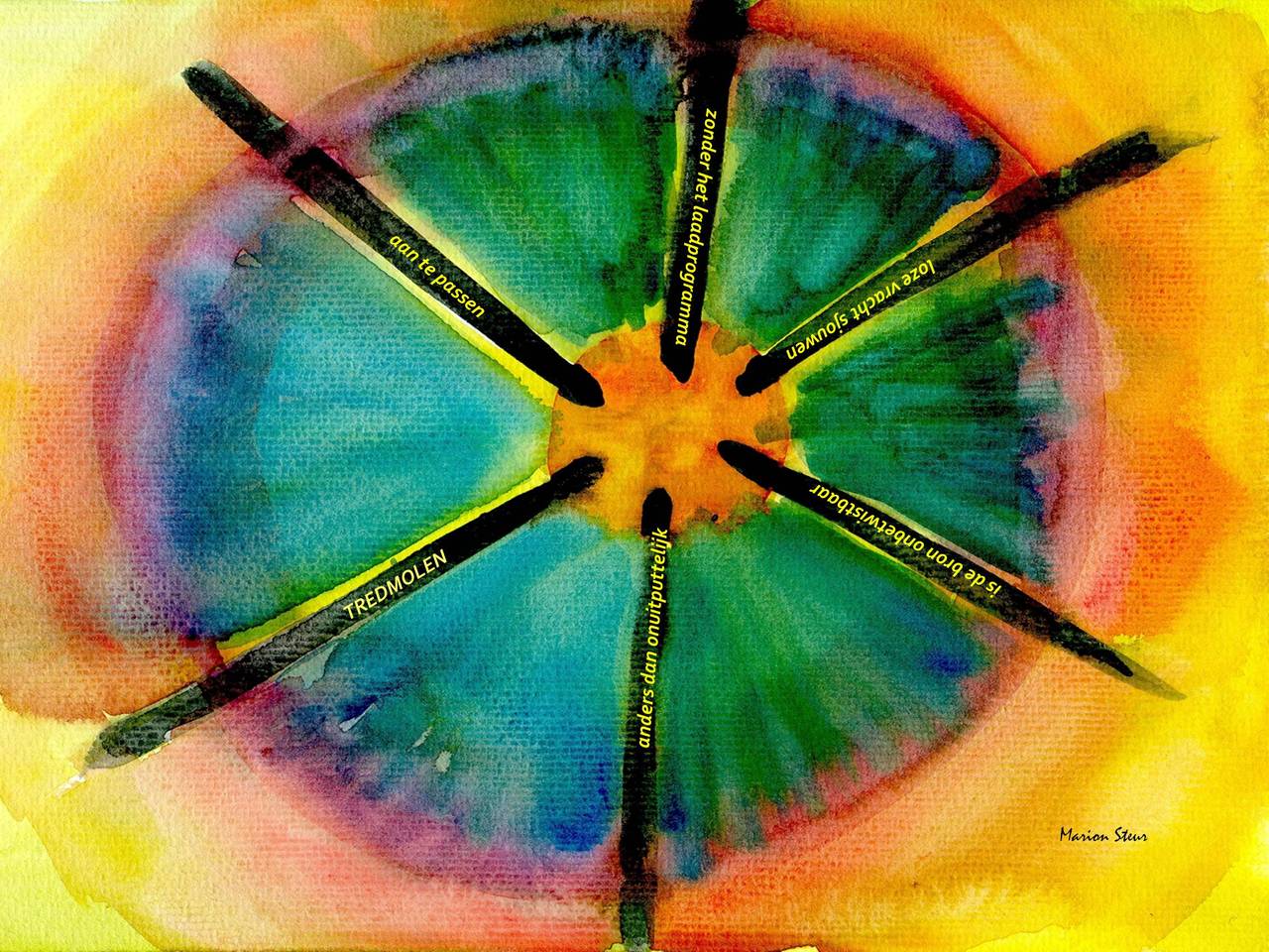 Tredmolen anders dan onuitputtelijk is de bron onbetwistbaar loze vracht sjouwen zonder het laadprogramma aan te passen Gedicht geïntegreerd in aquarel, digitaal bewerkt, print op canvas. Deze uitvoering meet 45 cm hoog en 55 cm breed. Andere formaten in overleg. Oplage 5 stuks.
