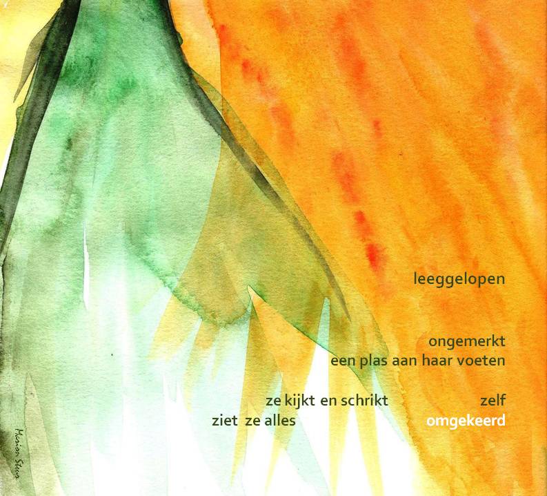 leeggelopen ongemerkt een plas aan haar voeten ze kijkt en schrikt zelf ziet ze alles omgekeerd digitaal bewerkte aquarel met gedicht