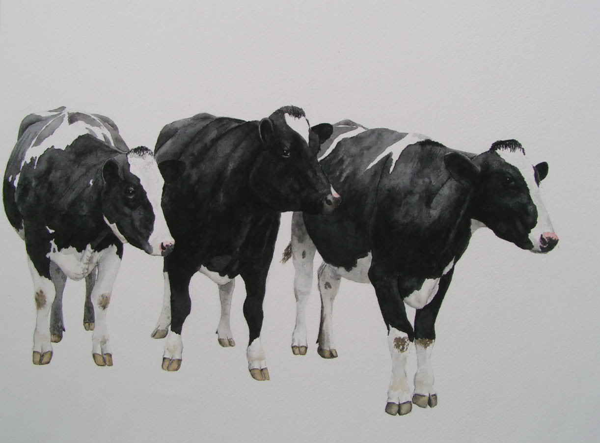 Drie zwartbonte Holsteiner koeien.