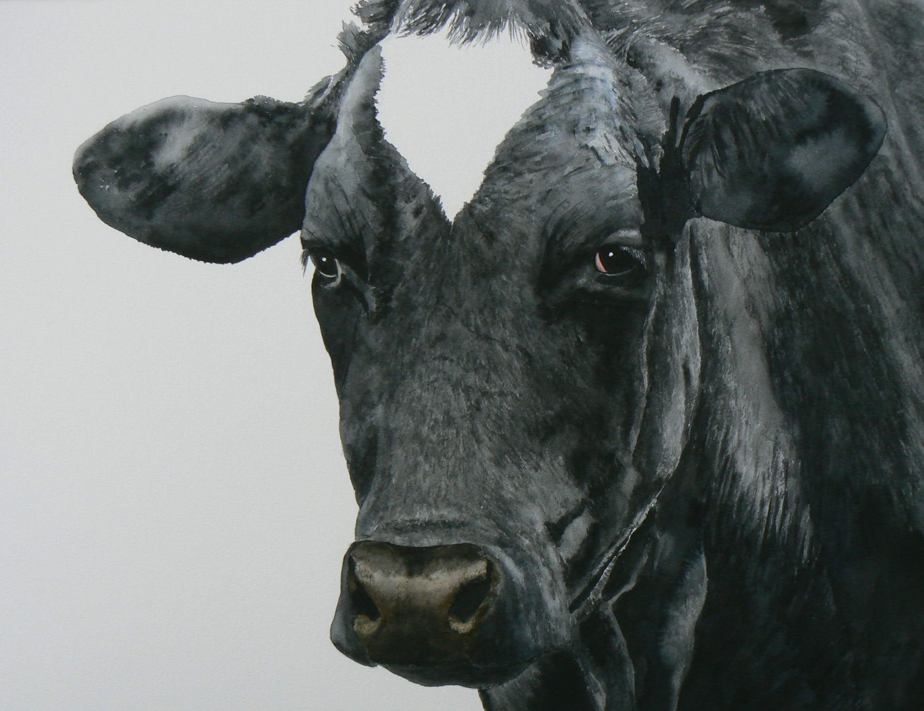 Een portret van een indrukwekkende zwarte Holsteiner koe. Heel fijn geschilderd, heel fijn om te doen. Alle prijzen van aquarellen zijn inclusief de lijst en passepartout.