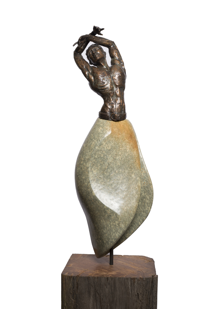 In Trans 1, danser. Gemaakt van brons en serpentijn. Juni 2014 Totale hoogte op de houten sokkel is 1.60 cm.