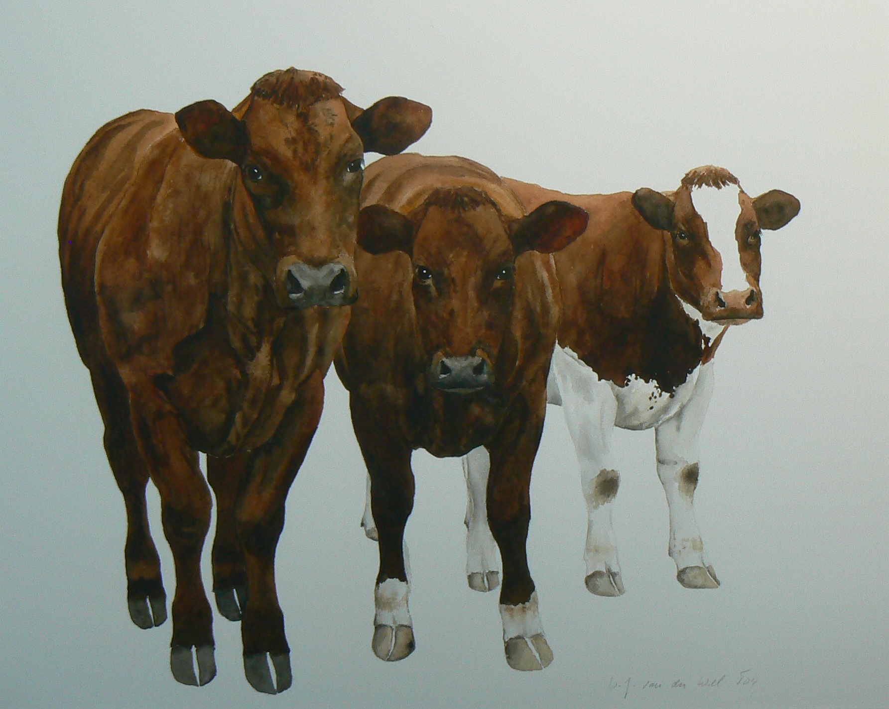 Drie roodbruine koeien kijken nieuwsgierig naar de kijker, er hoeft maar wat te gebeuren of ze gaan er van door.
