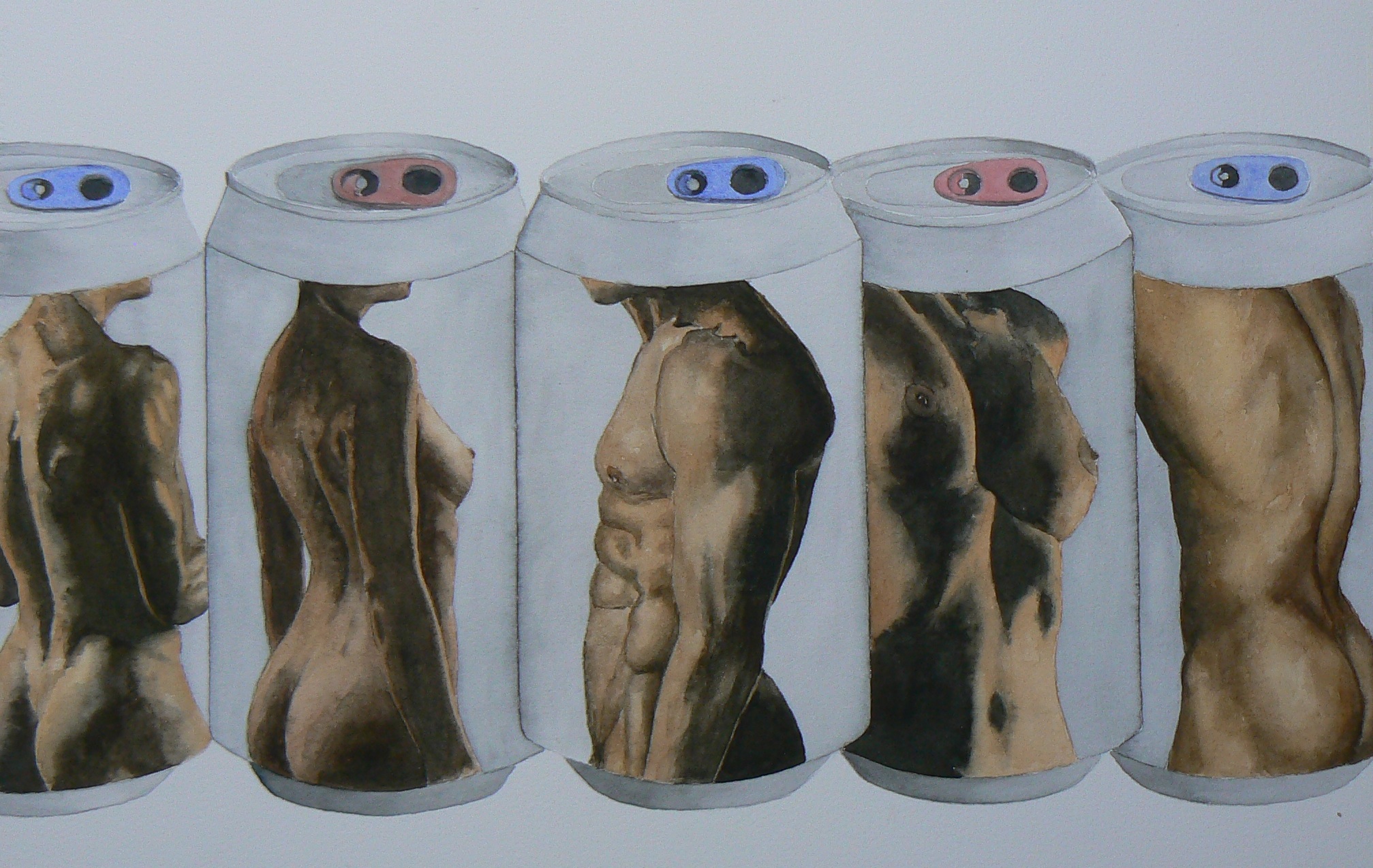 Blikjes vormen mijn podium om iets te tonen of te vertellen. Soms is dat gebruik van kunst voor reklamedoeleinden of het laten zien van een alom bekend merk of iets alledaags. Hier zijn torso's afgebeeld, die de mens tonen in al zijn verscheidenheid. Alle prijzen van aquarellen zijn inclusief de lijst en passepartout.
