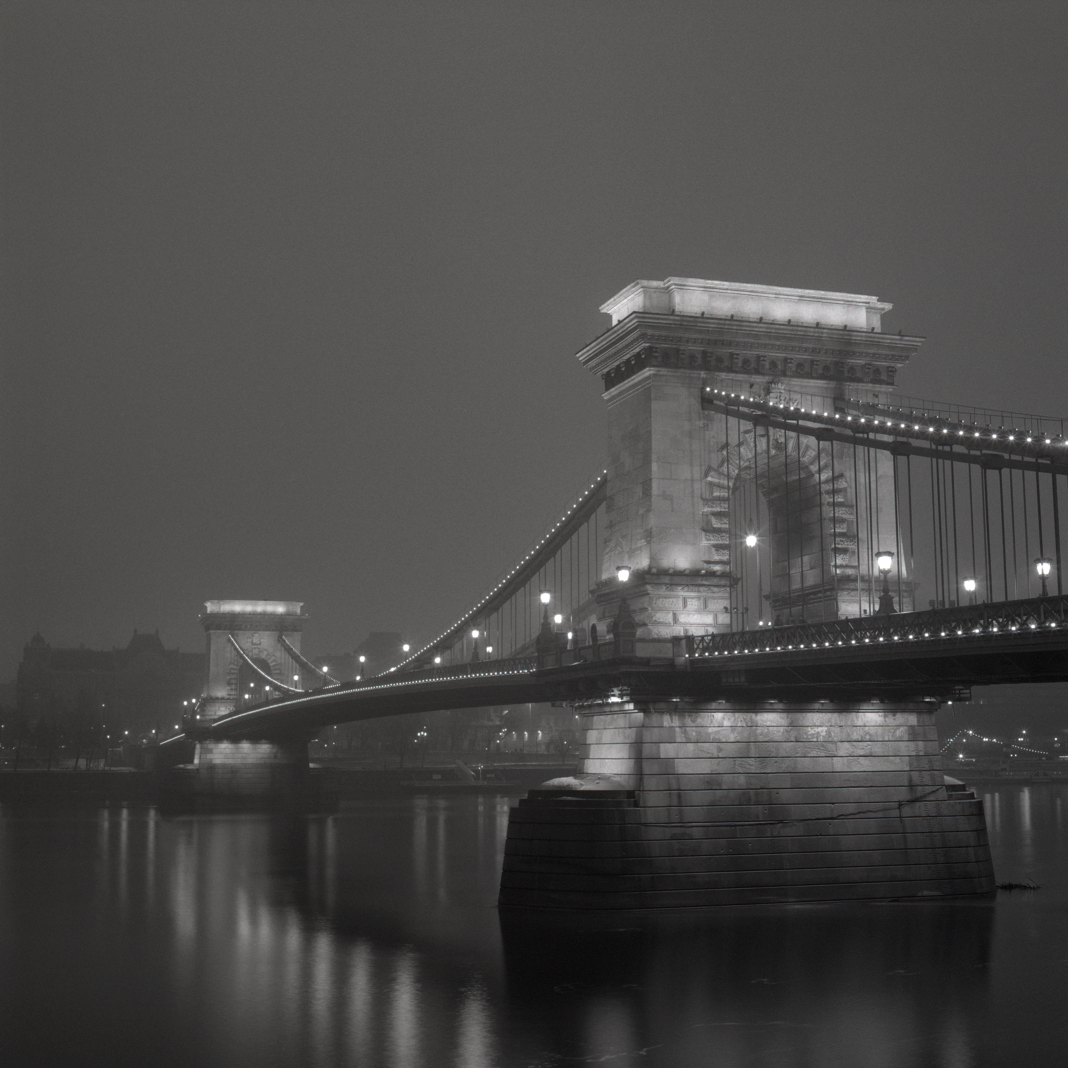 Zwart wit foto van de Chainbridge in Boedapest in een mistige nacht C-print op 1.5 mm aluminium voorzien van ophangsysteem. Tegen meerprijs ook beschikbaar als Plex-photo