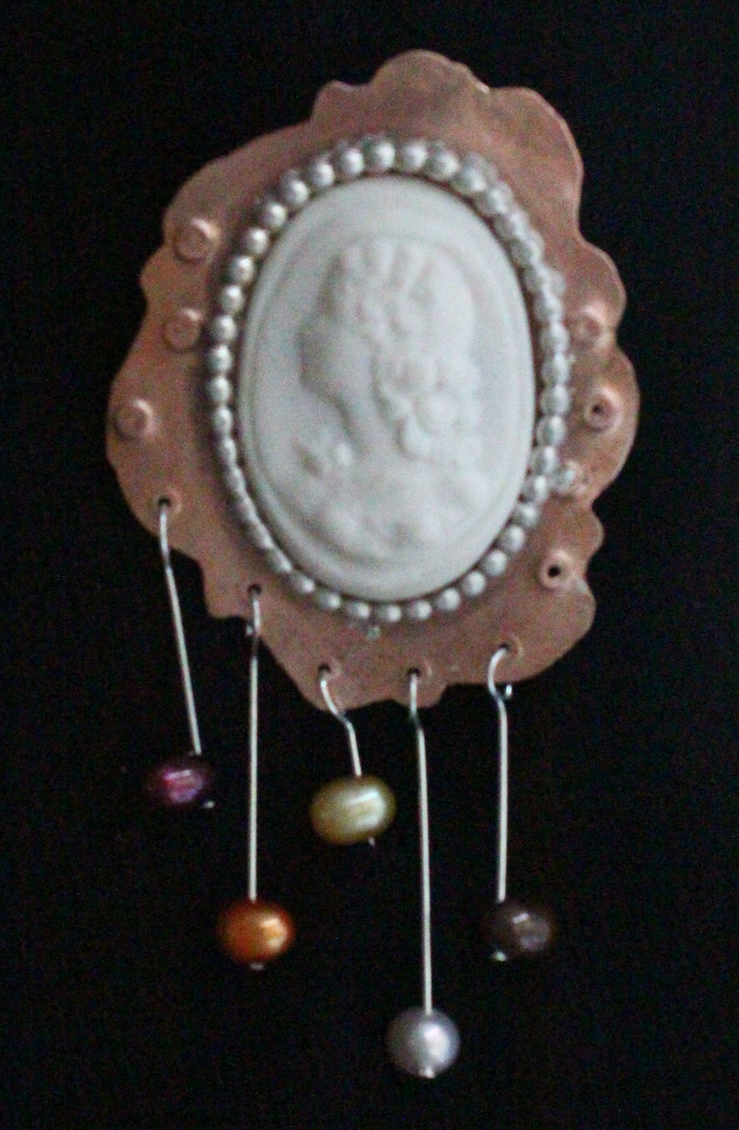 Een Camee van porselein, klassiek in modern jasje. Op koper, met 5gekleurde parels