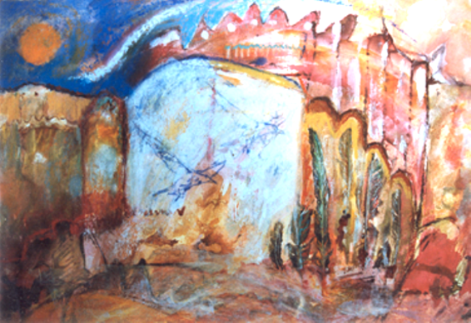 Terugvliegende vogels in een poëtisch landschap. Aquarel en gem. techn. op dik lithopapier in lijst.