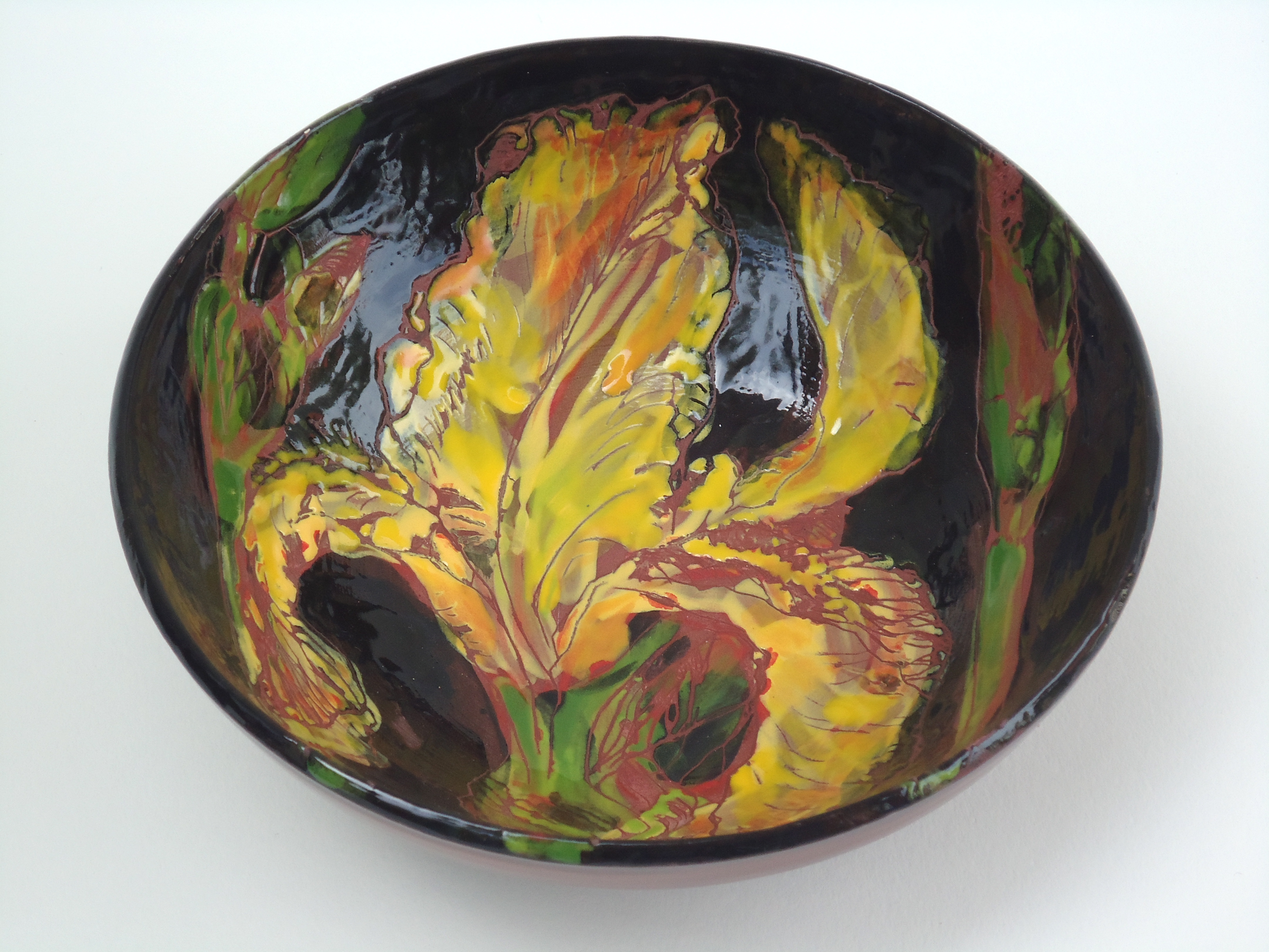 De ronde vorm van mijn keramiekschalen - die ik zelf draai - schept een ideale ruimte om bloemen, bomen en landschappen te verbeelden en in te sluiten. Zo kan ik tekenen, schilderen en ruimtelijk vormen met elkaar combineren.